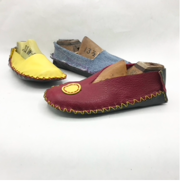 These simplest shoes are designed for being made in countries where parasites may enter the soles of barefoot children. They are made from only two materials – leather, fabric or felted wool for uppers, and bike or motorcycle inner tube for the soles.